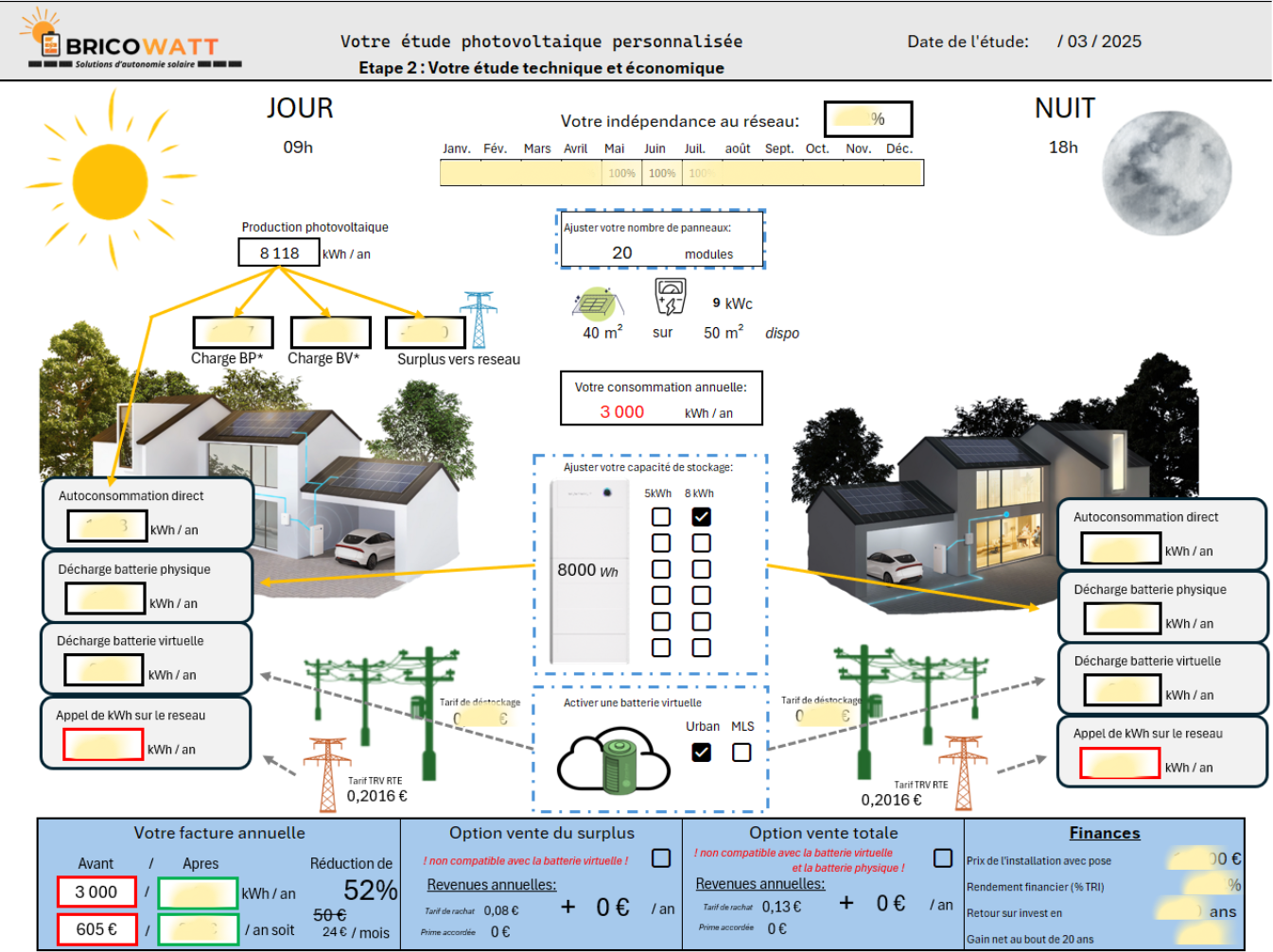 Autoco seule, revente surplus, batterie virtuelle, vente totale. Tous les scenarios en une simulation de 2 min !